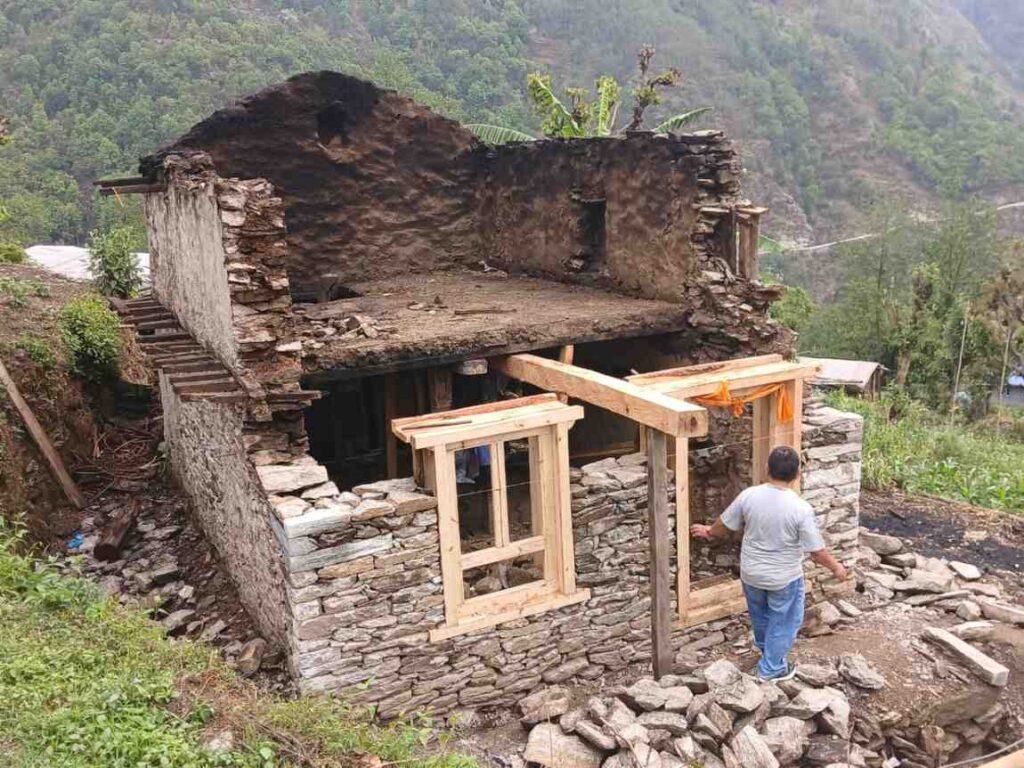 In Bung, Solukhumbu, Mr. Kubir Rai’s house was completely destroyed by a natural disaster, leaving his family without proper shelter. The Partners Nepal (TPN) provided timely support by installing a new roof, enabling the family to safely return to their home. This assistance brought critical relief during a difficult time, and the family expressed deep gratitude to TPN for restoring their sense of security and comfort.